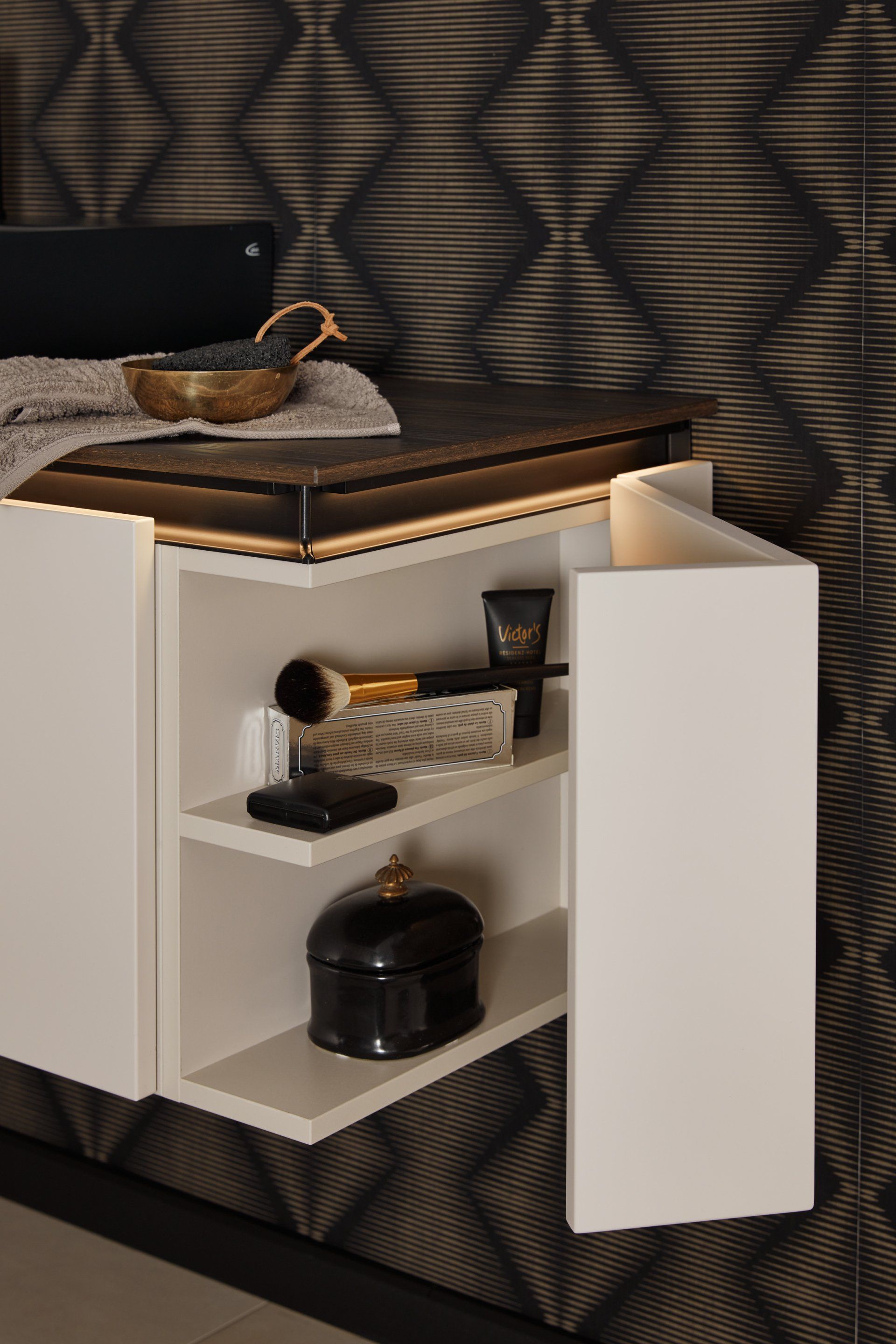 The details make the difference. Our bathroom vanities and accessory furniture are perfectly protected from dust and moisture through sealing edges. Cabinets in carcase colors are identical in decor, both inside and out, while our LED Emotion lighting can be used for mirrors or open compartments with a remote control or the wave of your hand.